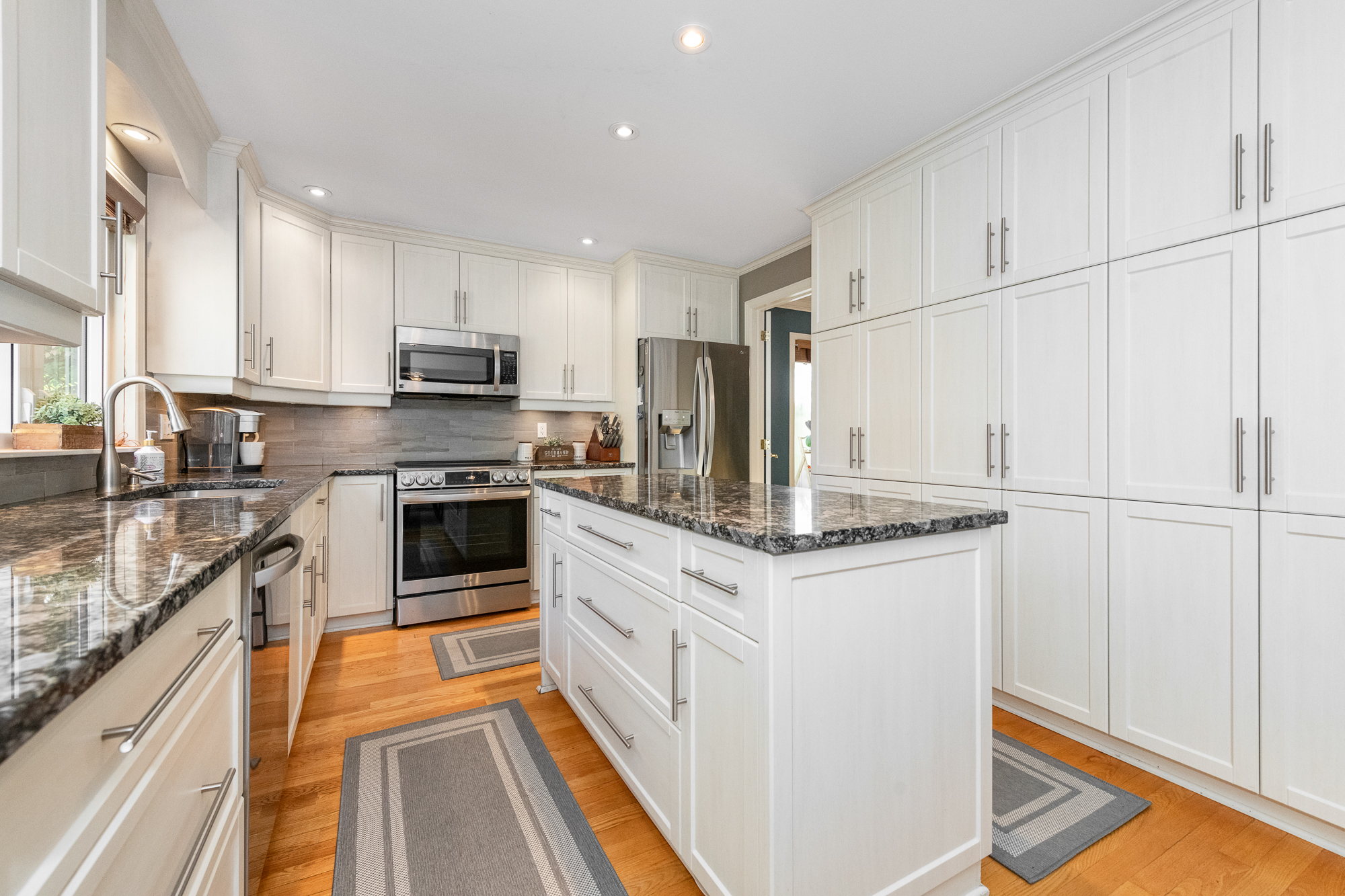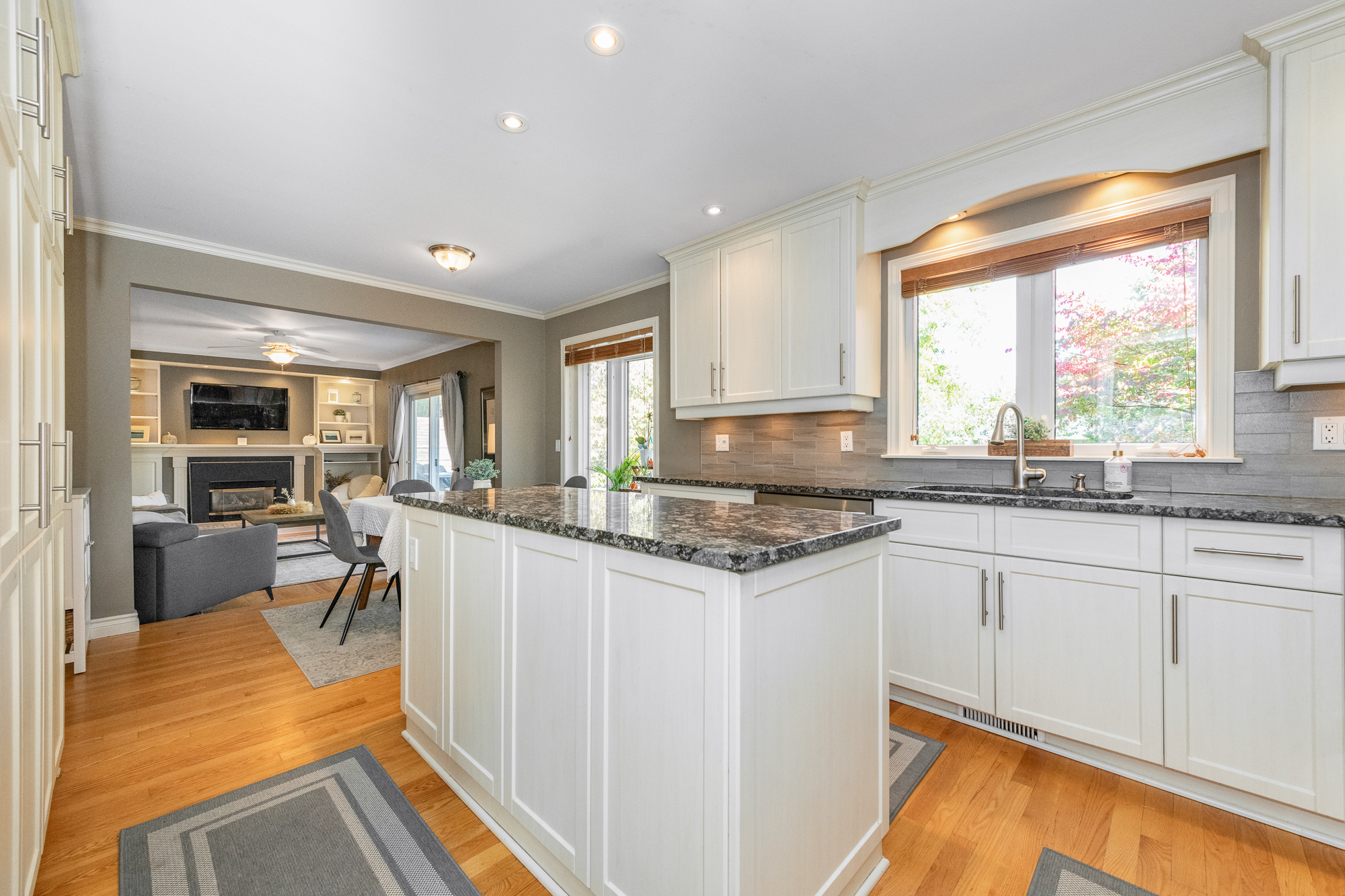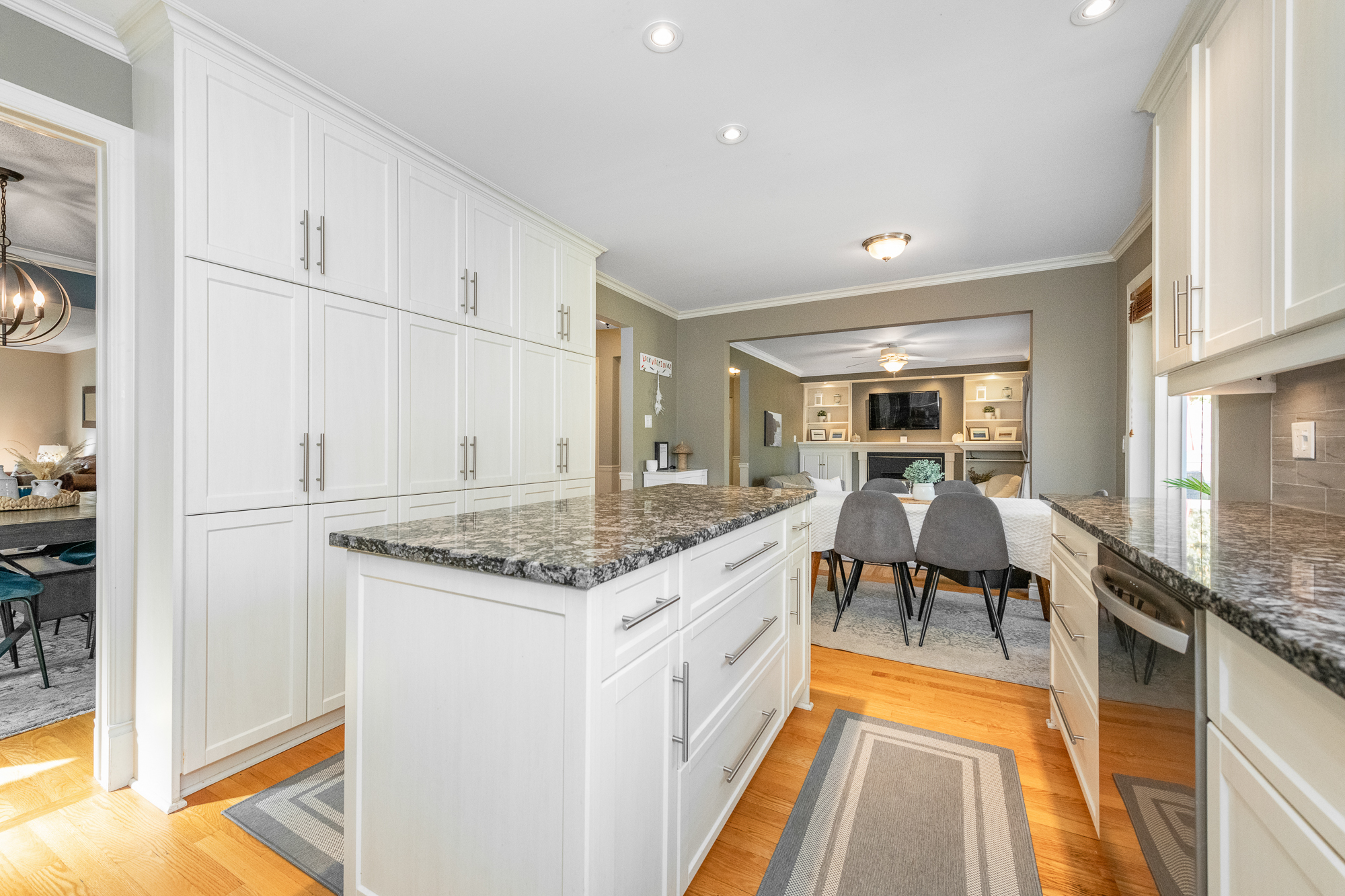 Cooking will become an enjoyable task in the updated kitchen offering sleek granite countertops, shaker-style cabinetry including pot drawers, tile backsplash, and every cook’s dream, a wall-to-wall pantry. The bright eating area enjoys tranquil views of the back yard setting and is open to the family room, featuring an attractive fireplace, built-in cabinetry, and patio doors offering plenty of natural light and easy access to the back yard. Mud room with extra-large closet (originally housing the laundry, which has been relocated to the lower level), and powder room are conveniently located.
