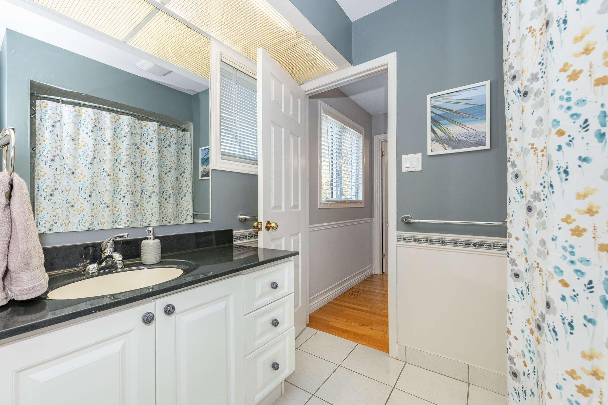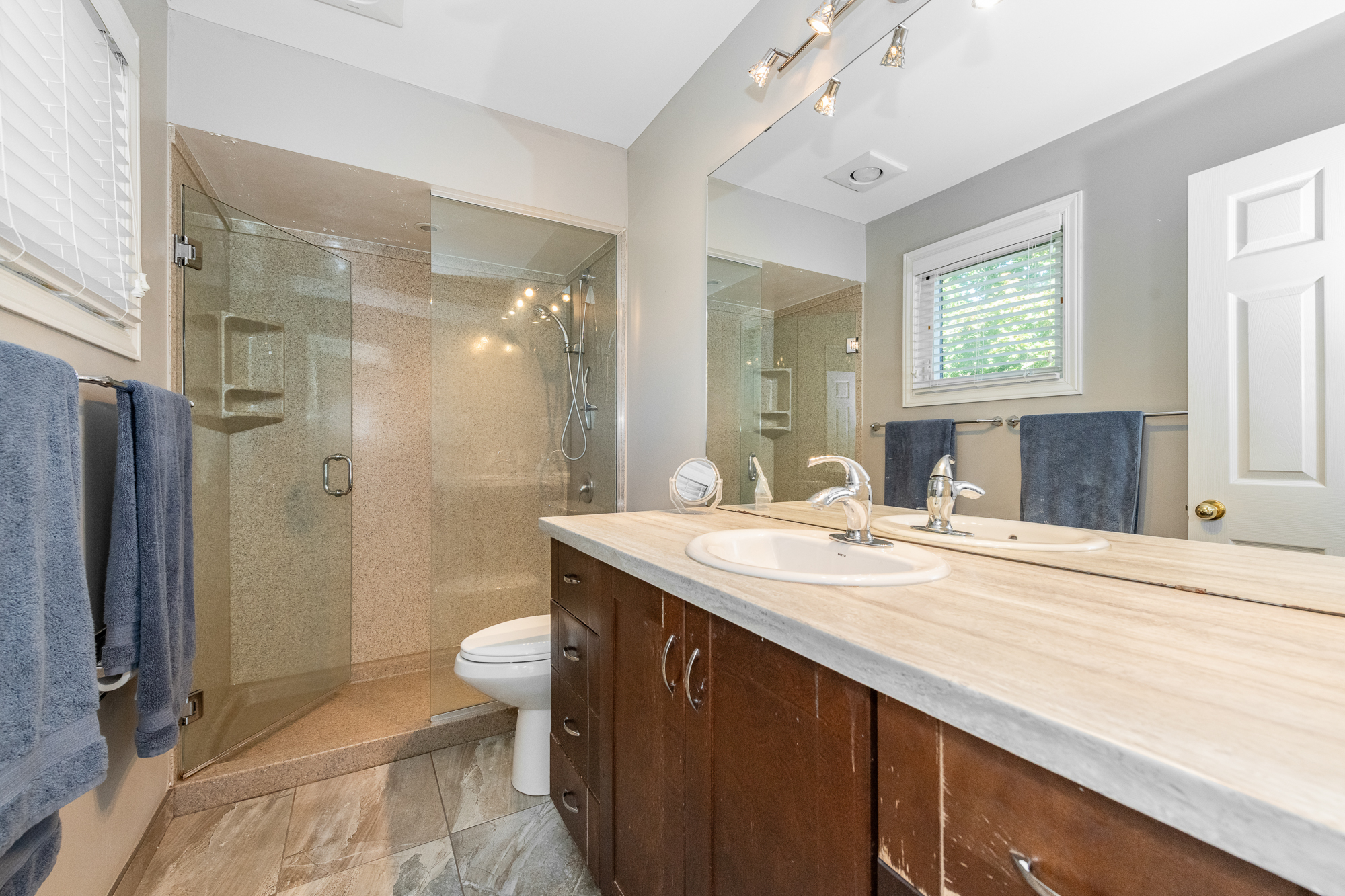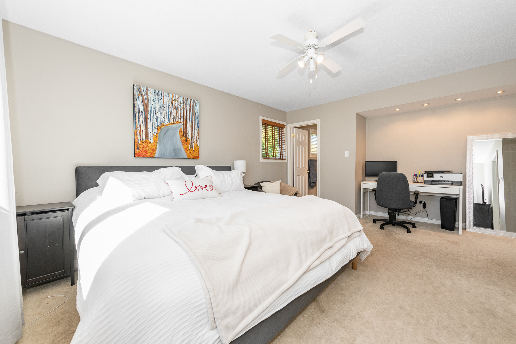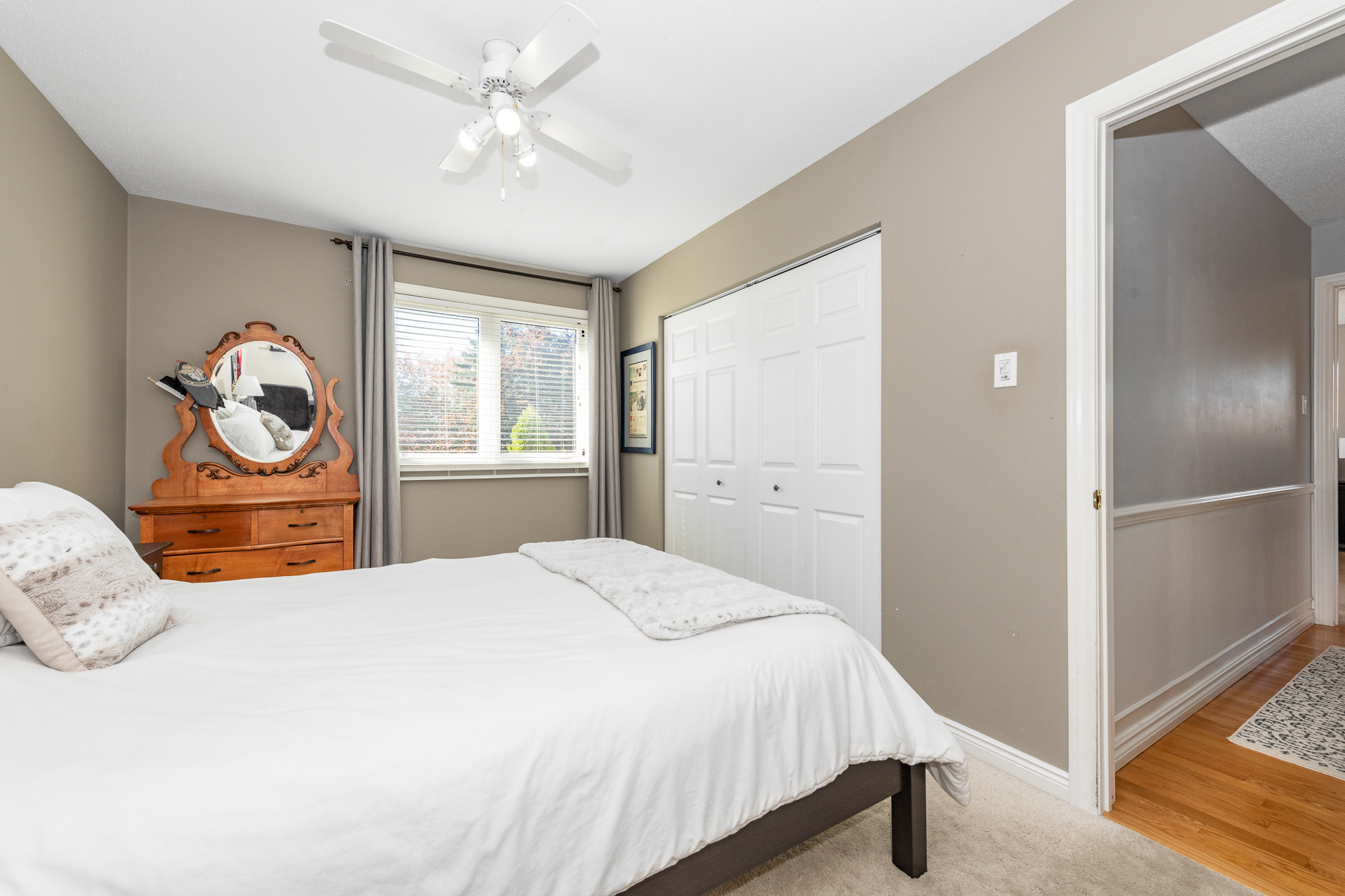 Hardwood staircase leads to the 2nd level. Originally a 4-bedroom, the 4th bedroom has been converted to a luxury walk-in closet for the primary bedroom (seller will reinstate if requested), which also enjoys a private ensuite bath with a glass shower stall. Two additional bedrooms are well proportioned with ample closet space, and the main bath is a 4-piece.