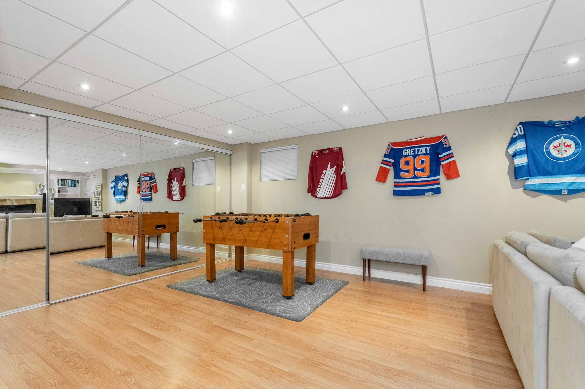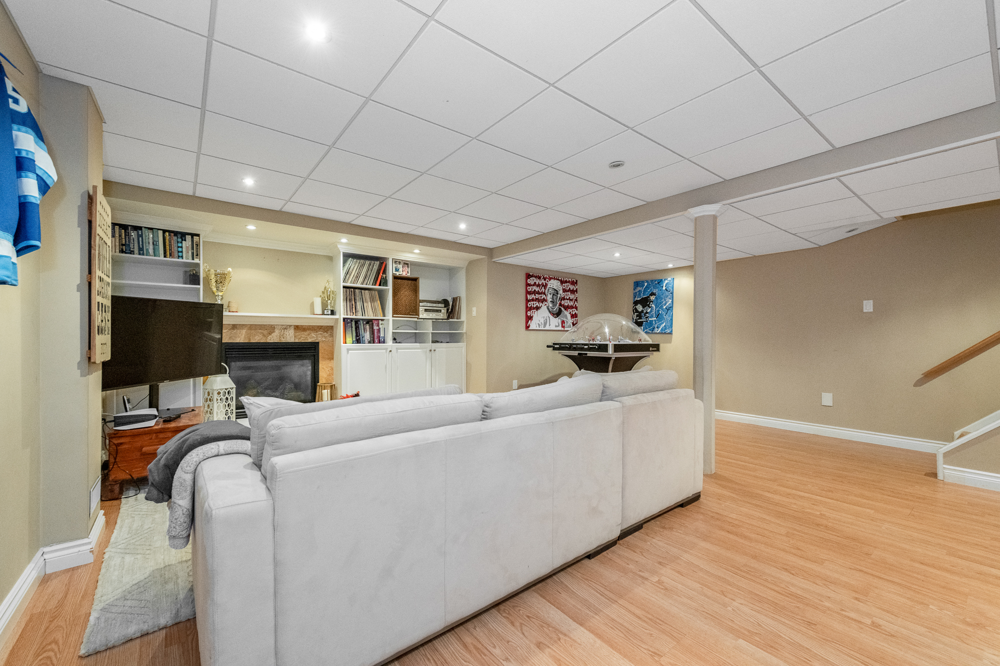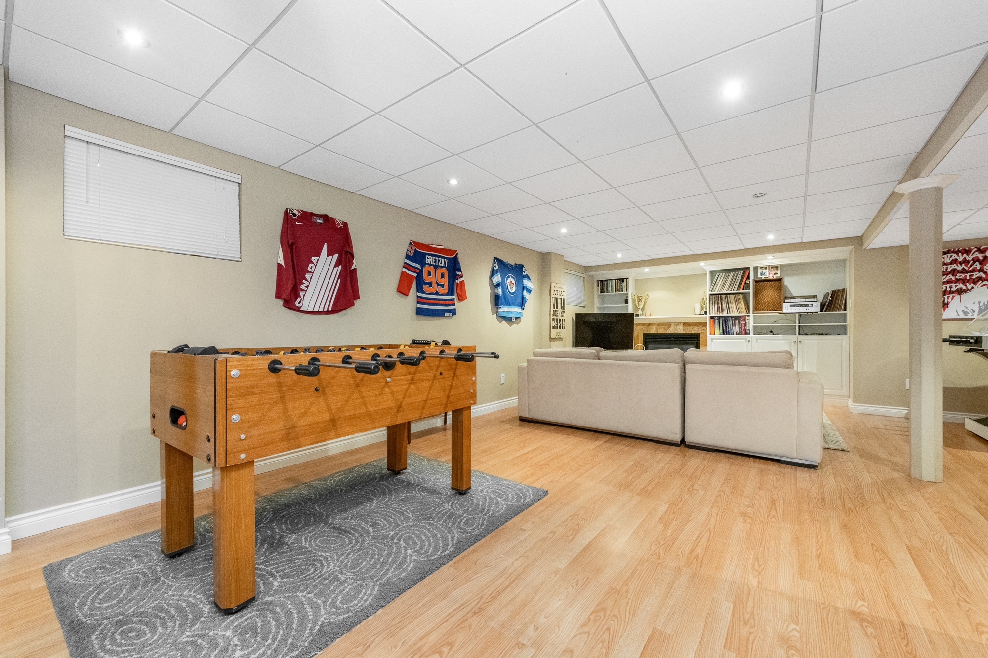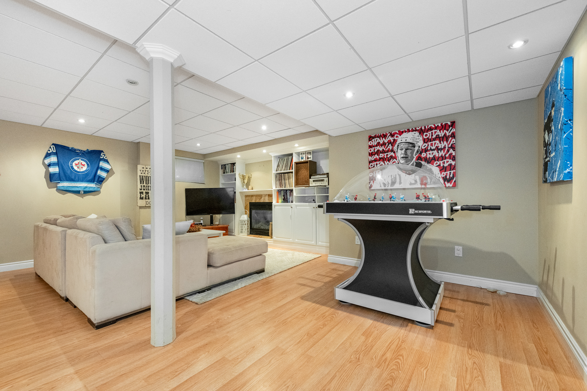 The lower level has been developed to include a recreation room with a second fireplace and wall-to-wall cabinetry, office/hobby room and the oversized relocated laundry with plenty of storage space.